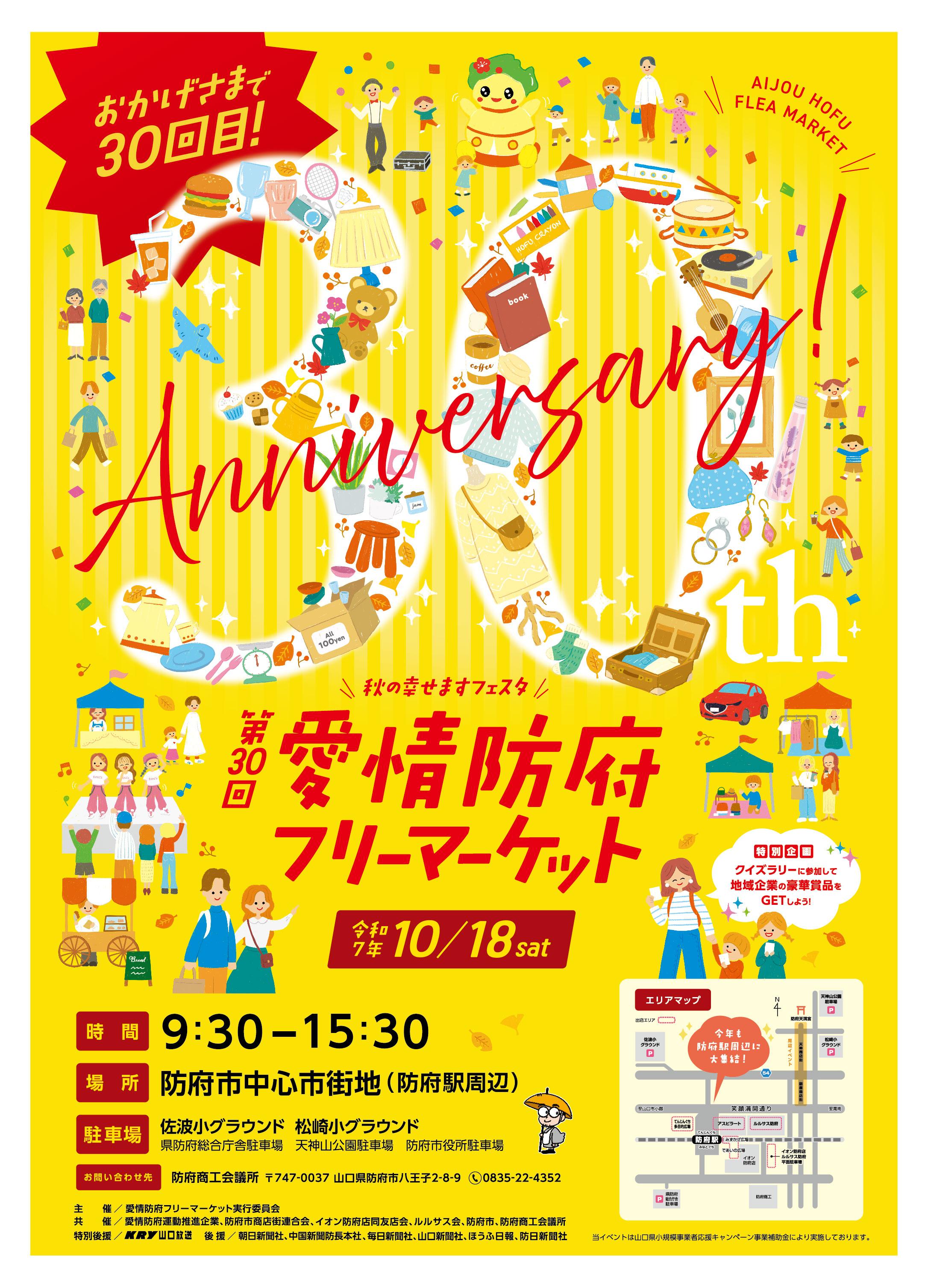 「愛情防府フリーマーケット」は、山口県及び防府市に事業所を置く企業が「防府市の活性化・街づくりのために協力しよう」という主旨のもと、平成5年より展開している「愛情防府運動」のメインイベントです。コロナ禍の中断など多くの歴史を刻み、みなさまに愛され、今大会で第30回を迎えることとなりました。